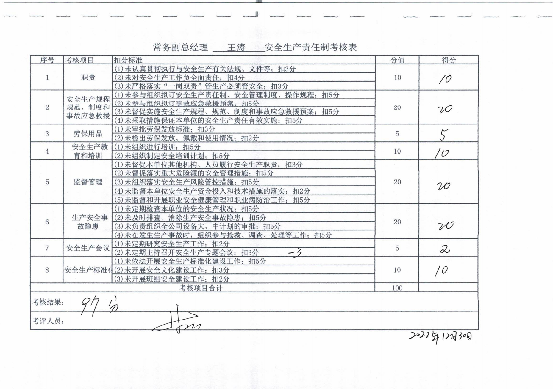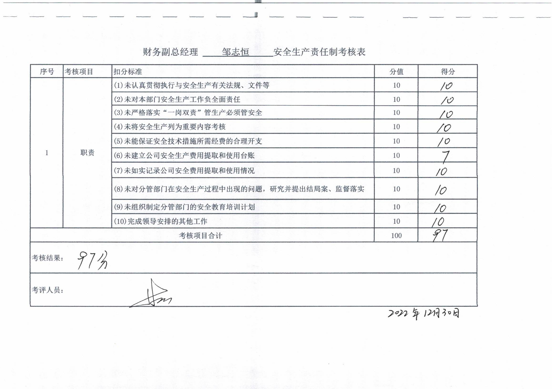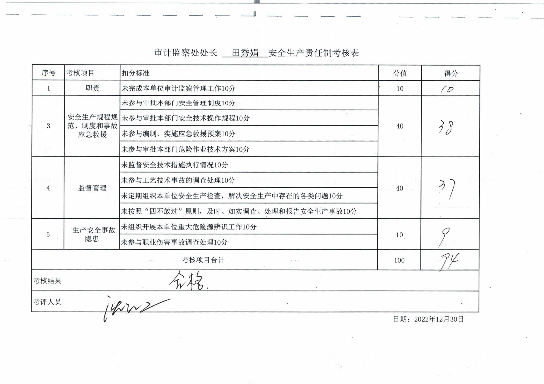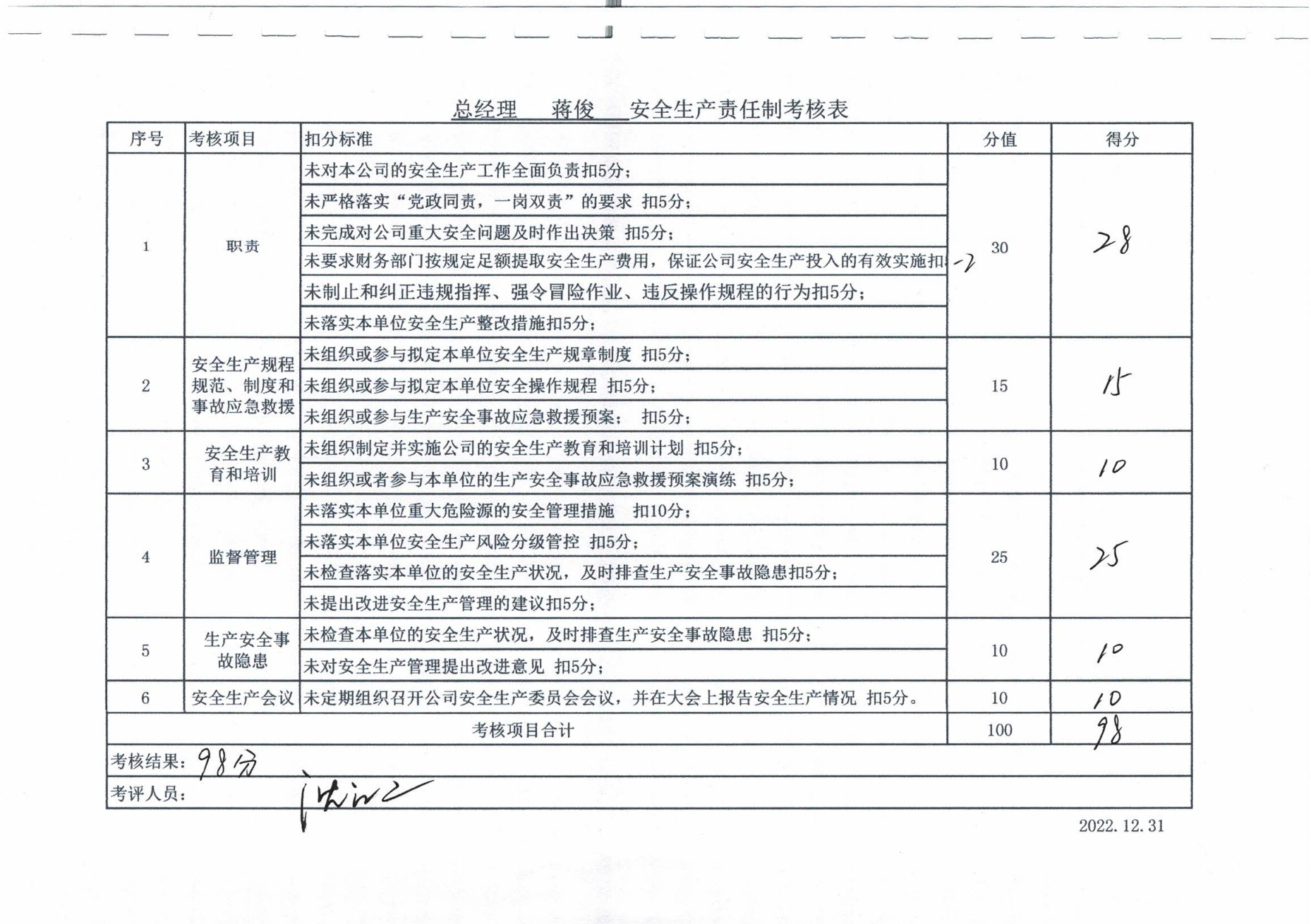 2022年主要负责人安全生产责任制考核公示